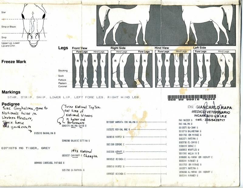 nata da Degon Helios, anica, e Mg Tiger, iscritta al Purebred Arabian Horse. Certificato autentico di iscrizione e di importazione dagli U.S.A., in mio possesso, in originale.Iscritta all'UNIRE, come cavallo atleta agonista, ha passaporto FISE ed ? ovviamente in possesso di certificazione e libretti asl apa regolari, comprese vaccinazioni eccetera. Discendente, sempre per linea materna, da Camiraff, purosangue atleta arabo che, tra i vari riconoscimenti, ? stato stallone dell'anno, con la dedica di ampi spazi sulle pi? importanti riviste americane del cavallo arabo, Arabian Horse World.
